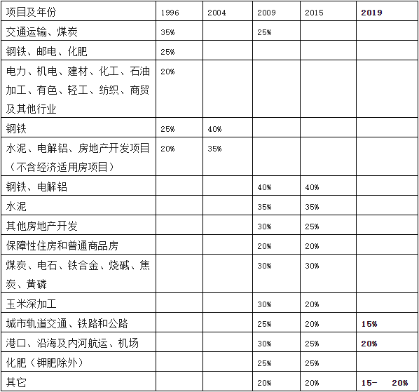 国发〔1996)35号规定了项目资本金占总投资最低比例,后续年份多次发文调整,具体整理如下: