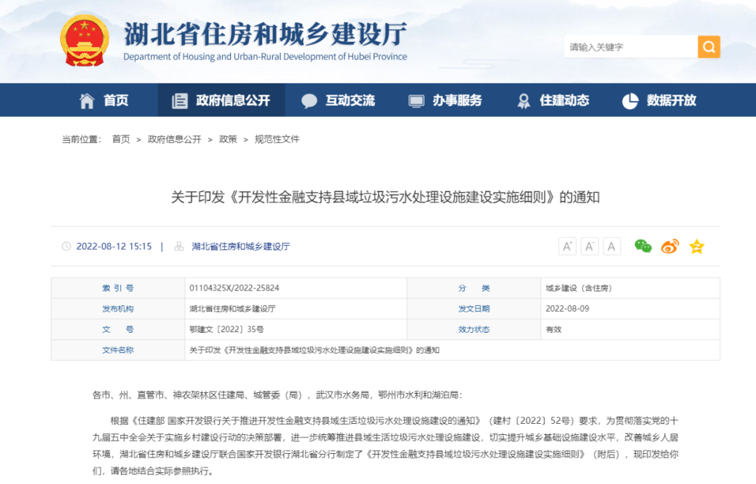 近日,湖北省住建厅发布关于印发《开发性金融支持县域垃圾污水处理设施建设实施细则》的通知,力争完成“十四五”期间湖北省县域垃圾污水处理设施高标准全覆盖的工作目标。