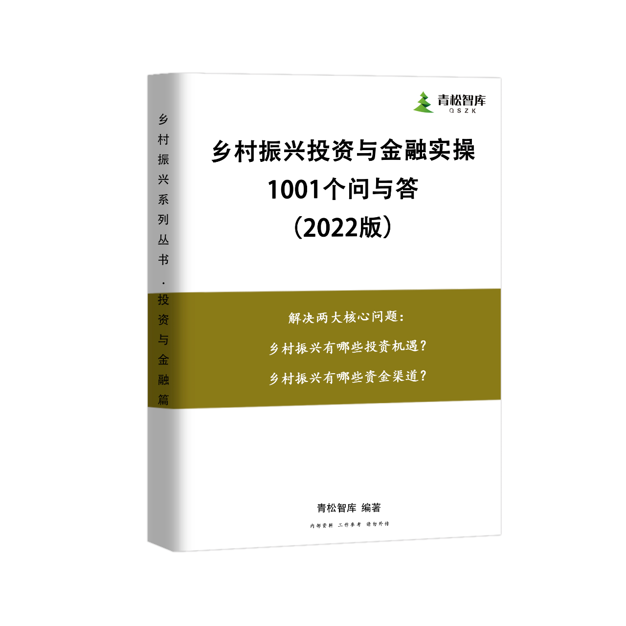 由青松智库编写的《乡村振兴投资与金融实操1001个问与答(2022版)》已正式刊印,全书600页,1001个关于乡村振兴投资与金融问题,干货满满。全书解决两大核心问题:一是乡村振兴有哪些投资机遇?二是乡村振兴有哪些资金渠道?需要联系:陈青松老师,电话:13552681418