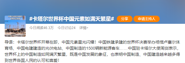 11月20日,2022年卡塔尔世界杯正式开幕。开幕式当天,中国外交部发言人华春莹在推特上连发8条推文,以图文并茂的方式介绍世界杯“随处可见的中国元素”。这也让“卡塔尔世界杯中国元素如满天繁星”的话题登上热搜。