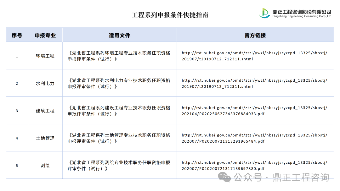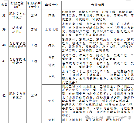 鄂职改办已下发《湖北省职称评审专业目录》(鄂职改办〔2021〕46号),其中工程系列已涵盖环保、水利水电、建筑、土地、测绘、规划等相关专业,详见下图: