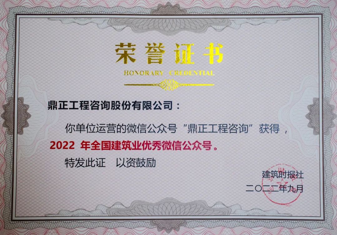 9月25-26日,由建筑时报社主办的2022建筑业微信公众号运维经验交流研讨会暨全国建筑业优秀公众号颁奖典礼在武汉举办。鼎正官方微信公众号“鼎正工程咨询”上榜全国建筑业优秀微信公众号榜单,荣获2022年全国建筑业优秀微信公众号。