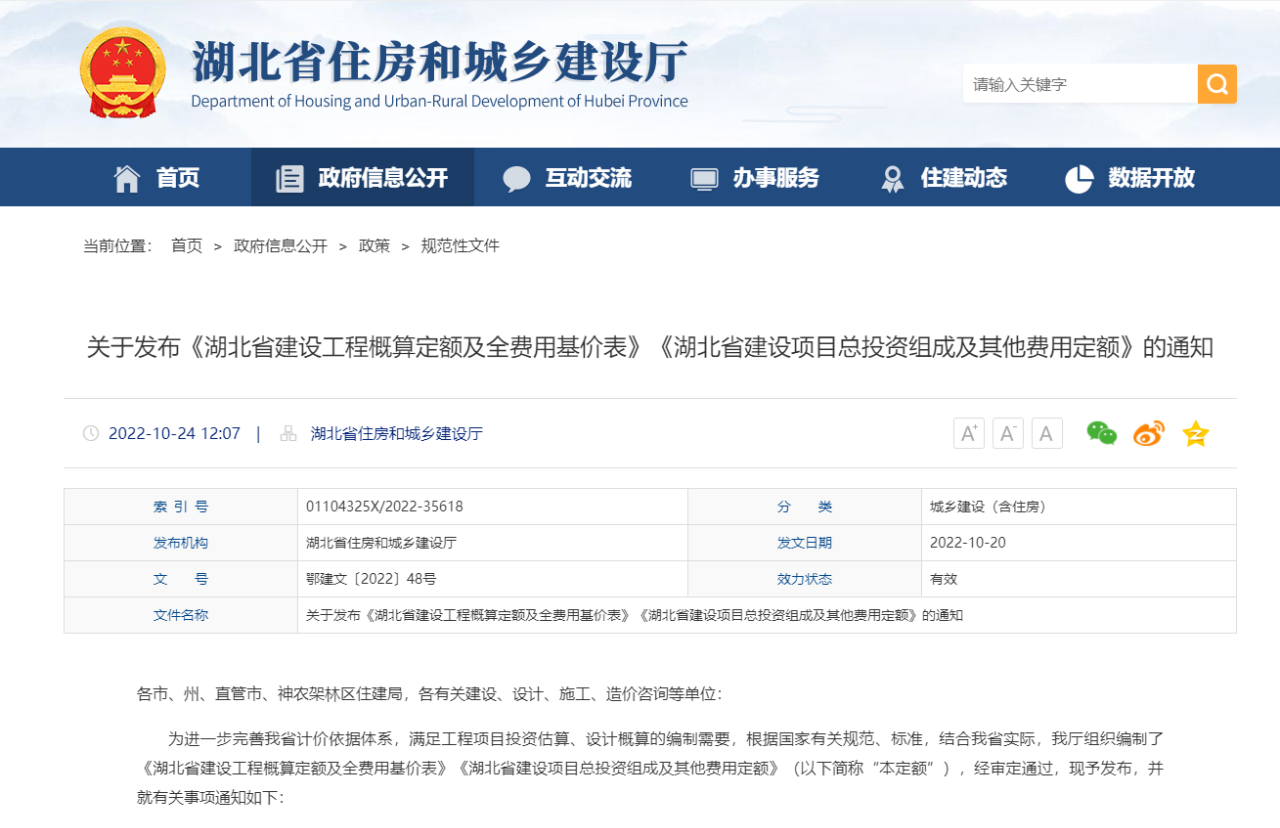 湖北省住建厅发布《湖北省建设工程概算定额及全费用基价表》《湖北省建设项目总投资组成及其他费用定额》的通知