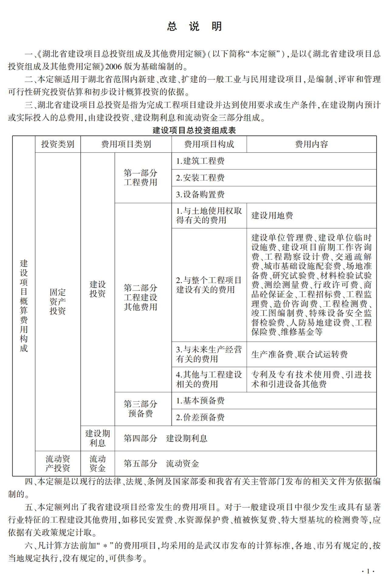 一、《湖北省建设工程概算定额及全费用基价表》是我省工程项目建设投资评审、编制设计概算和对设计方案进行技术经济分析的依据。《湖北省建设项目总投资组成及其他费用定额》是编制、评审和管理可行性研究投资估算和初步设计概算投资的依据。