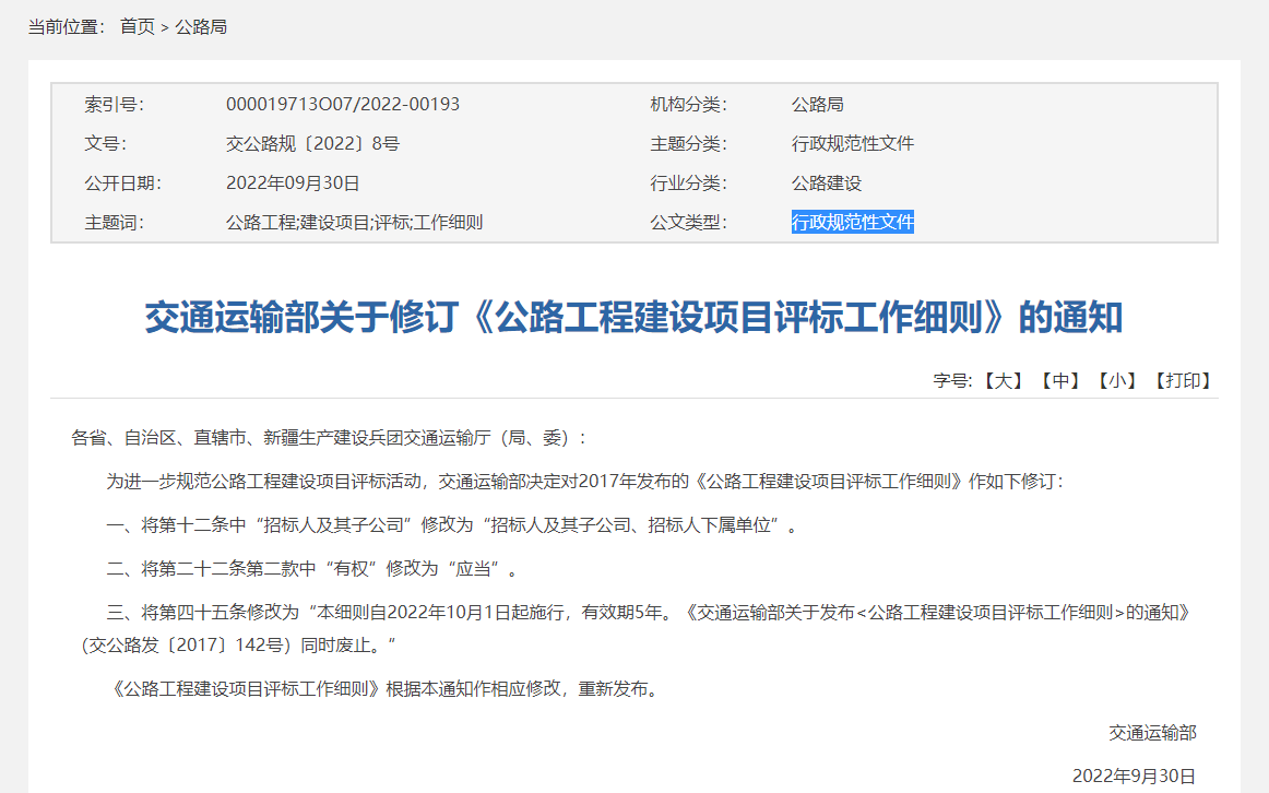 2.交通运输部发布《公路工程建设项目评标工作细则》的通知