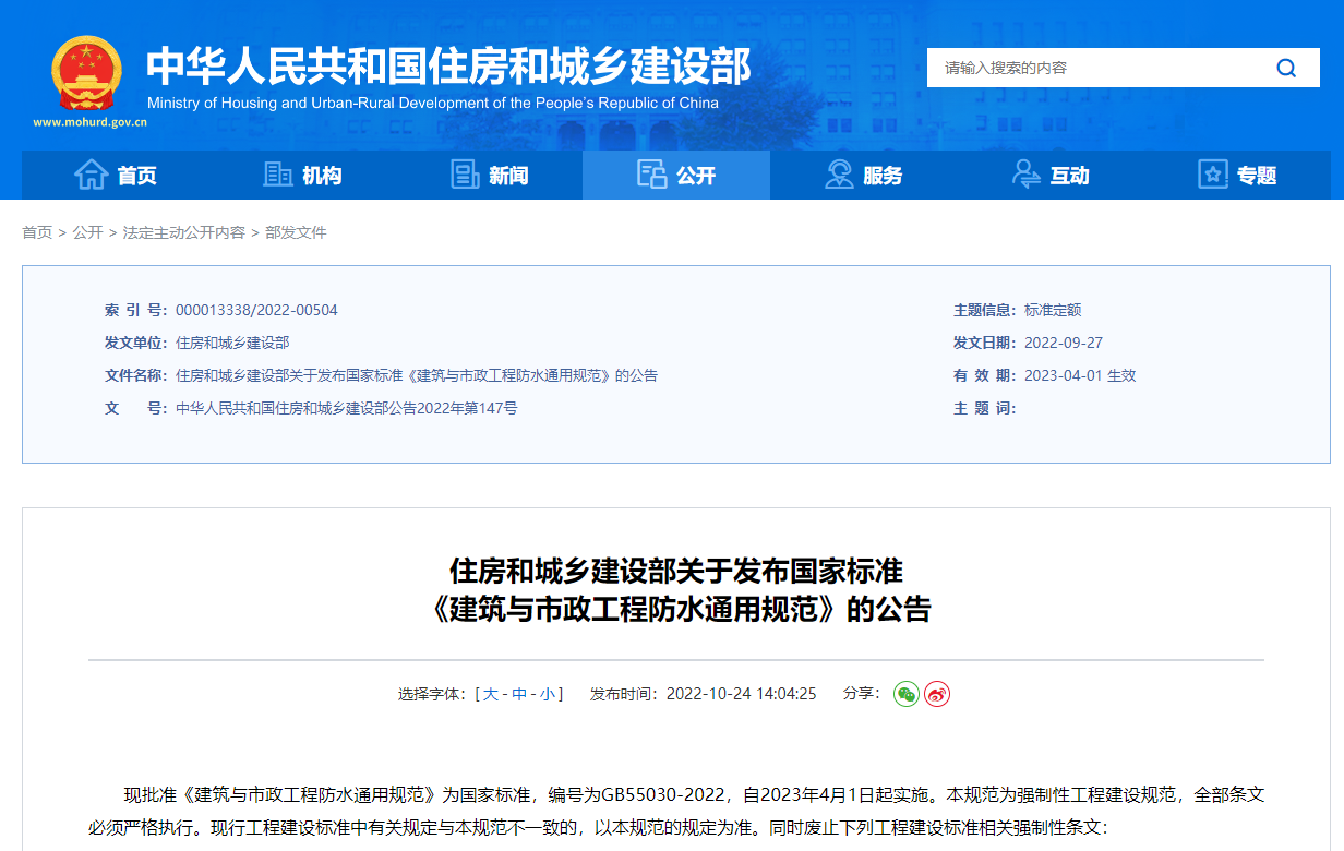 10月24日,住建部发布国家标准《建筑与市政工程防水通用规范》的公告。现批准《建筑与市政工程防水通用规范》为国家标准,编号为GB55030-2022,自2023年4月1日起实施。本规范为强制性工程建设规范,全部条文必须严格执行。现行工程建设标准中有关规定与本规范不一致的,以本规范的规定为准。