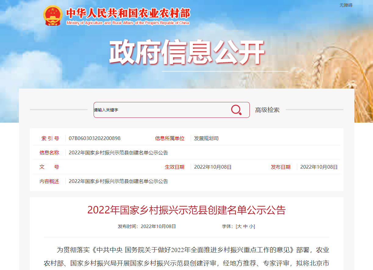 农业农村部、国家乡村振兴局开展国家乡村振兴示范县创建评审,经地方推荐、专家评审,拟将北京市大兴区等100个申报单位纳入2022年国家乡村振兴示范县创建名单,湖北省4地入围。