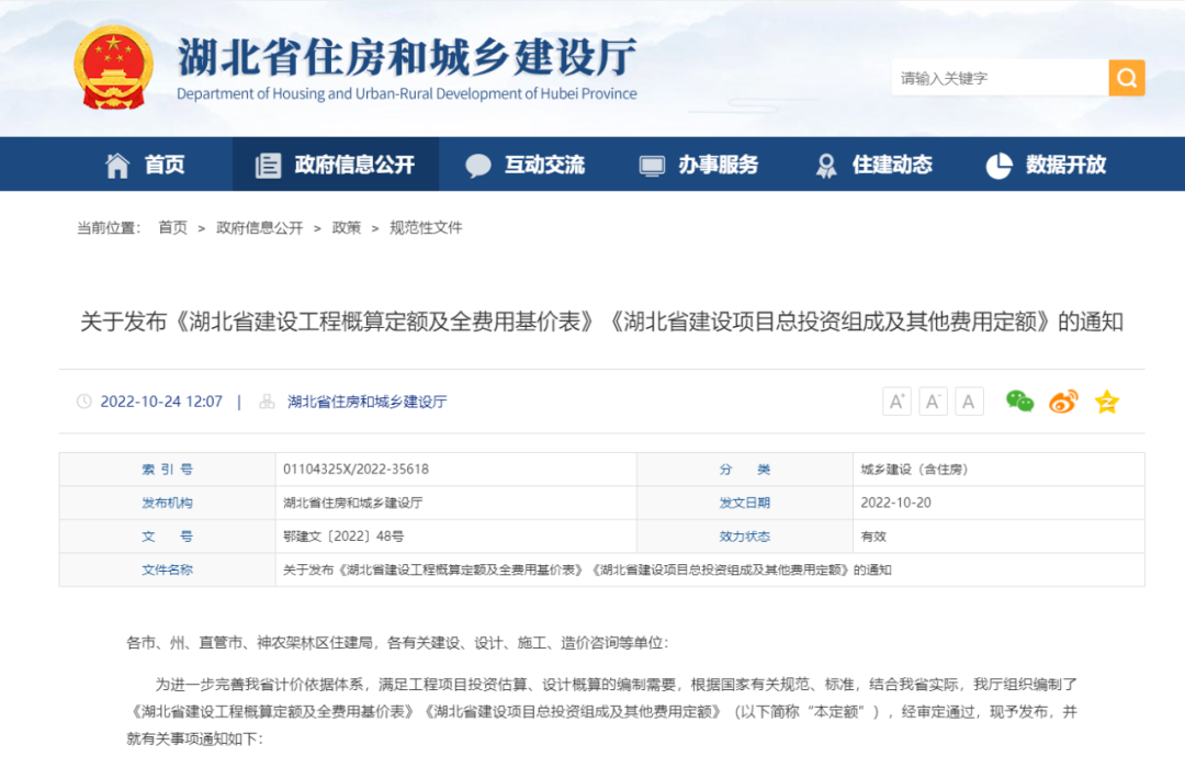 2.湖北省住建厅发布《湖北省建设工程概算定额及全费用基价表》《湖北省建设项目总投资组成及其他费用定额》的通知