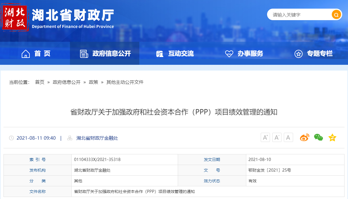 政策快递 | 湖北省财政厅:“花钱必问效,无效必问责”,规范PPP项目绩效管理工作