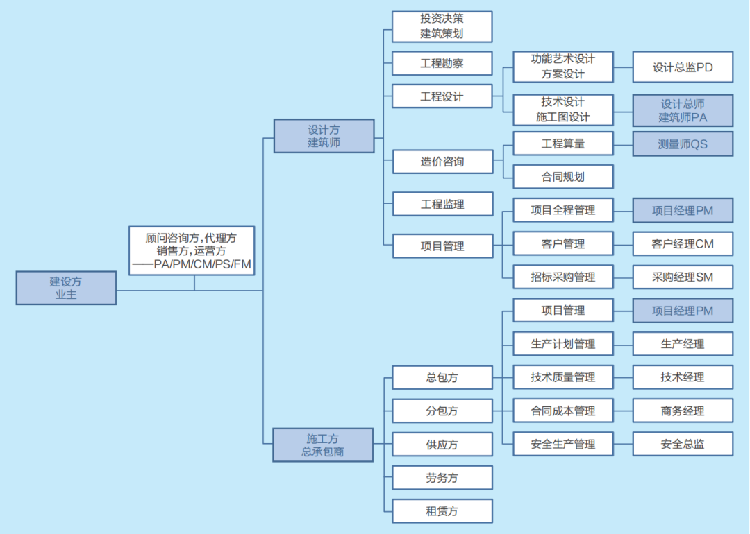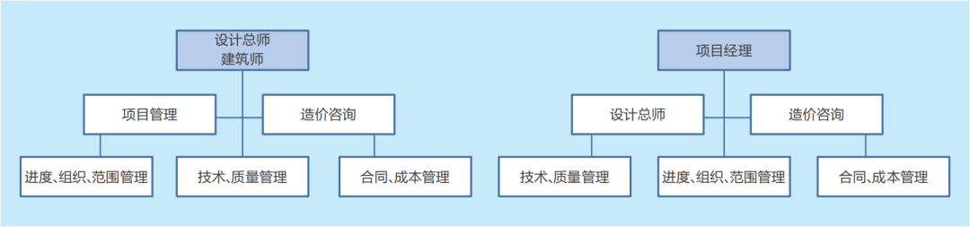 从上述建筑师服务的核心内容来看,项目管理、投资控制、策划、设计、招标采购、合同管理(我国目前主要是工程监理)都是重要的服务内容。在设计、采购、建造的全过程中,项目管理、造价咨询、工程设计是三个贯穿全程的核心服务,分别与功能、投资、进度、组织协调密切相关。从理论上说,建筑师及其团队应该掌握这三项核心能力,但是现实中一般不可能是一个人能够完整掌握这些能力,一般建筑工程的设计工作会有项目经理、建筑师(设计总师)两个角色分别负责技术与管理工作,类似制片人与导演的角色。同时,设计总师由于专业技能和分工的不同,会分为方案设计、效果设计和技术设计两类工作,还会分为设计总监(艺术总监,负责功能设计与效果呈现)、技术负责人(负责技术实现和符合法规)。