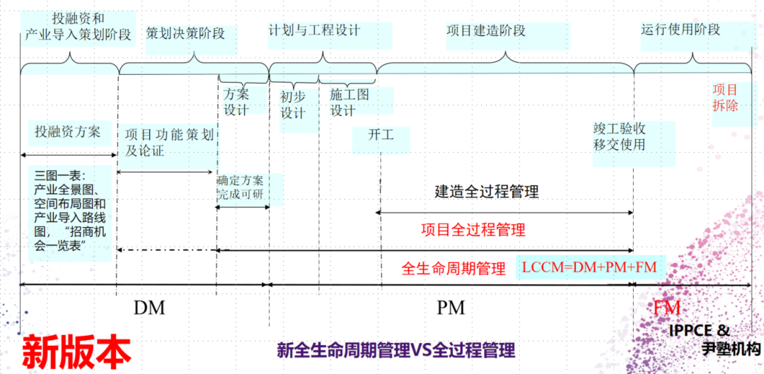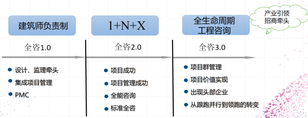 在总书记全生命周期管理思想的指导下,中国的“全咨”已经由“全过程工程咨询”过渡到“全生命周期工程咨询”,进入了全咨3.0时代。全咨3.0要点是全咨边界向前扩展到“招商引资”,向后延伸至“运营维护”。