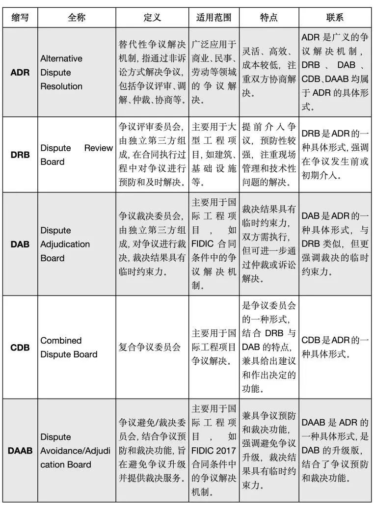 《替代性争议解决机制(ADR)中争议评审/裁决机制(DRB/DAB)的由来及演进》一文已经详细介绍了ADR(Alternative Dispute Resolution)替代性争议解决机制的概念及起源,以及在这种争议解决方式下DRB/DAB(Dispute Review Board/Adjudication Board)争议评审/裁决机制的演进。笔者将与之相近的几个概念也做一对比: