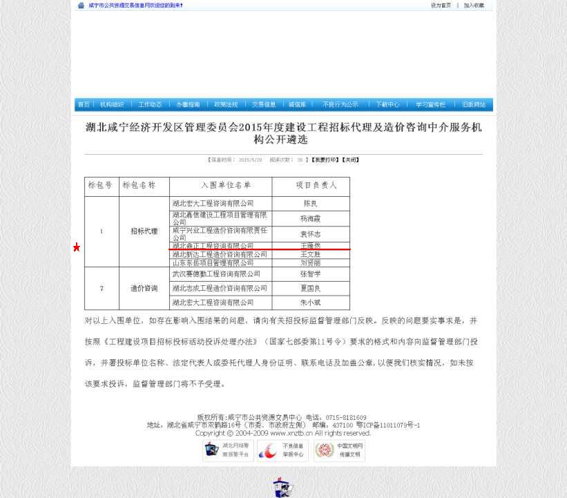 【经营成果】我司入围湖北咸宁经济开发区管理委员会2015年度建设工程招标代理及造价咨询中介服务机构库招标代理单位