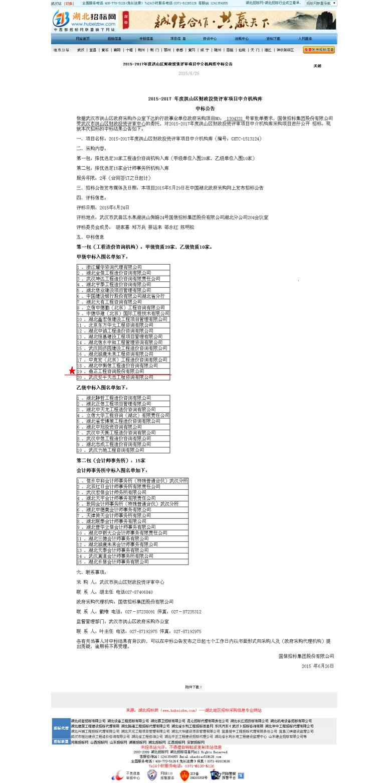 【经营成果】我司入围2015-2017 年度洪山区财政投资评审项目中介机构库