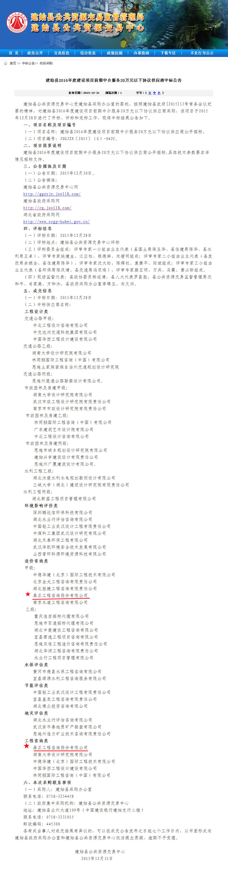 【经营成果】我司入选建始县2016年度建设项目前期中介服务20万元以下协议供应商