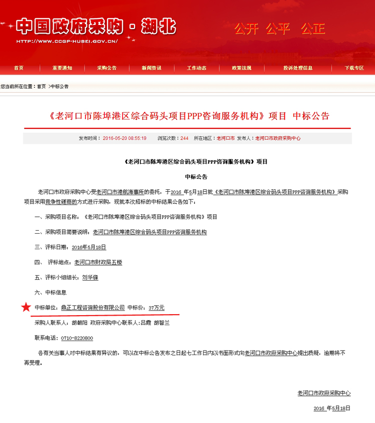 【经营成果】我司中标《老河口市陈埠港区综合码头项目PPP咨询服务机构》项目