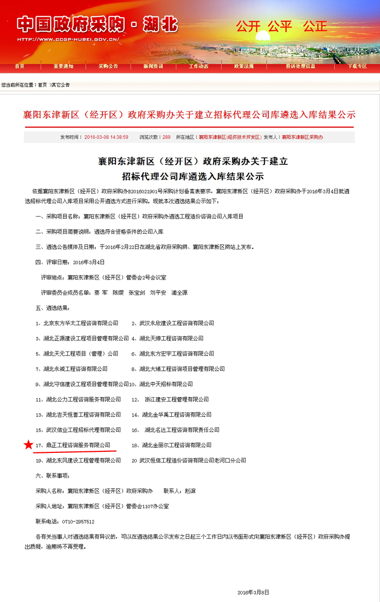 【经营成果】我司入围襄阳东津新区(经开区)政府采购办工程造价咨询公司库