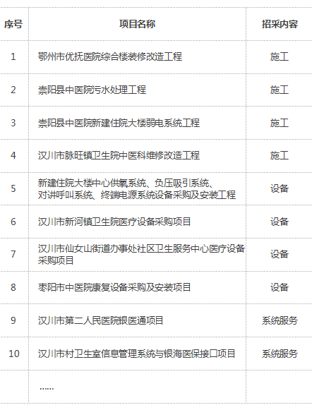 截止目前我司已为鄂州、咸宁、汉川、襄阳等地区的公立民营医院及基层医疗卫生机构提供了30多个项目的招采服务。