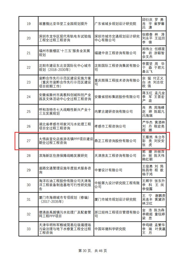 2019年12月27日,中国工程咨询协会公布了“2018年度全国优秀工程咨询成果奖”获奖项目名单,由鼎正咨询独立编制完成的《大悟县宣化店旅游名镇建设PPP项目全过程工程咨询报告》荣获全国优秀工程咨询成果三等奖!
