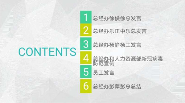 本次会议由人力资源部谭蓉主持,每位同事从自己的生活状态到对工作的汇报和对战胜疫情的决心中娓娓而谈,闲话家谈中表达出自己对未来生活的美好祝愿。