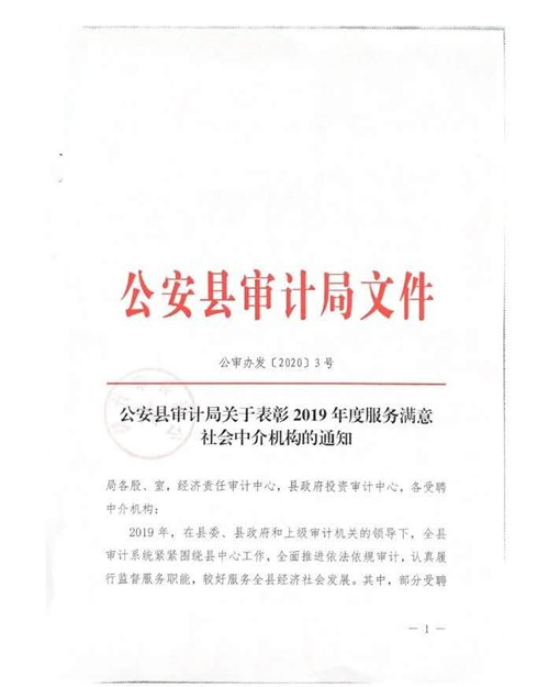 此次获评“2019年度服务满意单位”,也是对鼎正荆州分公司同事们工作成绩的高度认可!在今后的工作中,我们将继续恪守审计业务质量控制、风险控制等制度,坚持独立、客观、公正、公平的执业原则,为客户提供更优质更专业的咨询服务。
