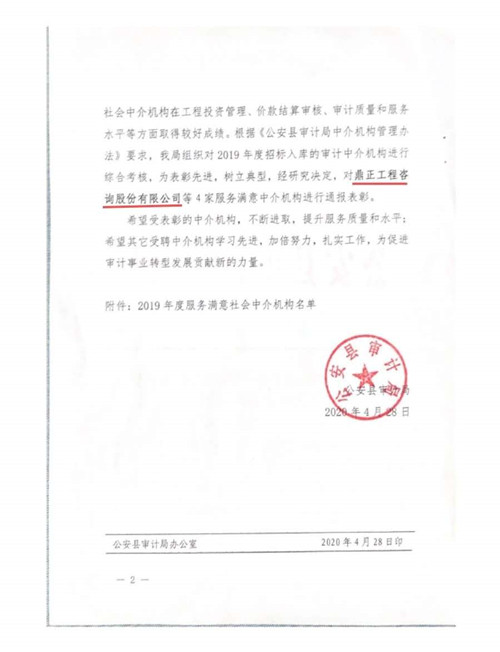 自2019年7月1日鼎正咨询成为公安县审计局的入库合作单位以来,荆州分公司同事们在工程竣工结算审计过程中,精心组织、合理安排、严于律己、廉洁从审,在确保重点工程顺利推进、节约政府资金、提高投资效益等方面做出了突出贡献,得到了公安县相关单位的一致好评,为公司赢得了信誉。