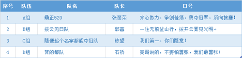 公司总部全员及分公司部分代表,共分为4个队伍参赛。为保证全员参与且不受题目限制,全体员工跨部门分组,每组成员均由业务部门及非业务部门人员组成,最终分为A、B、C、D四组。