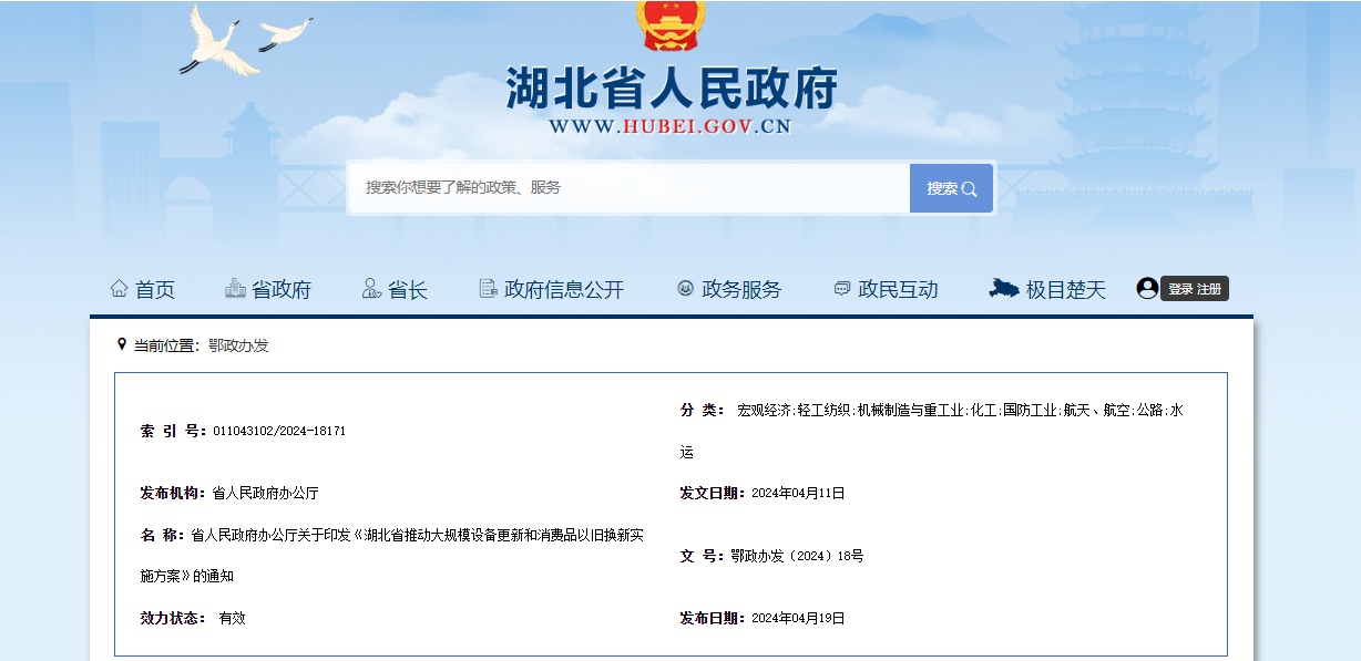 4月19日,湖北省人民政府网发布省人民政府办公厅关于印发《湖北省推动大规模设备更新和消费品以旧换新实施方案》的通知。