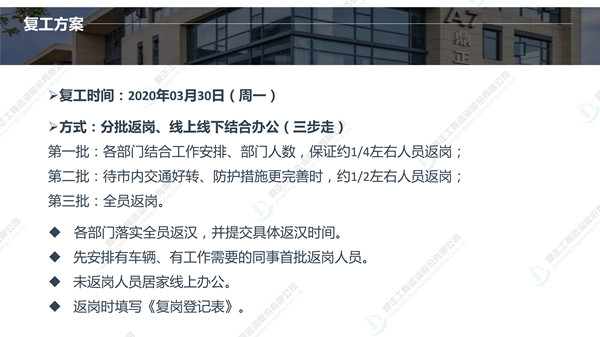分批返岗、线上线下结合办公,鼎正人的复工准备工作正有序进行。在疫情防控、复工复产两手抓的同时,鼎正咨询将一如既往地为客户提供专业的全过程工程咨询服务